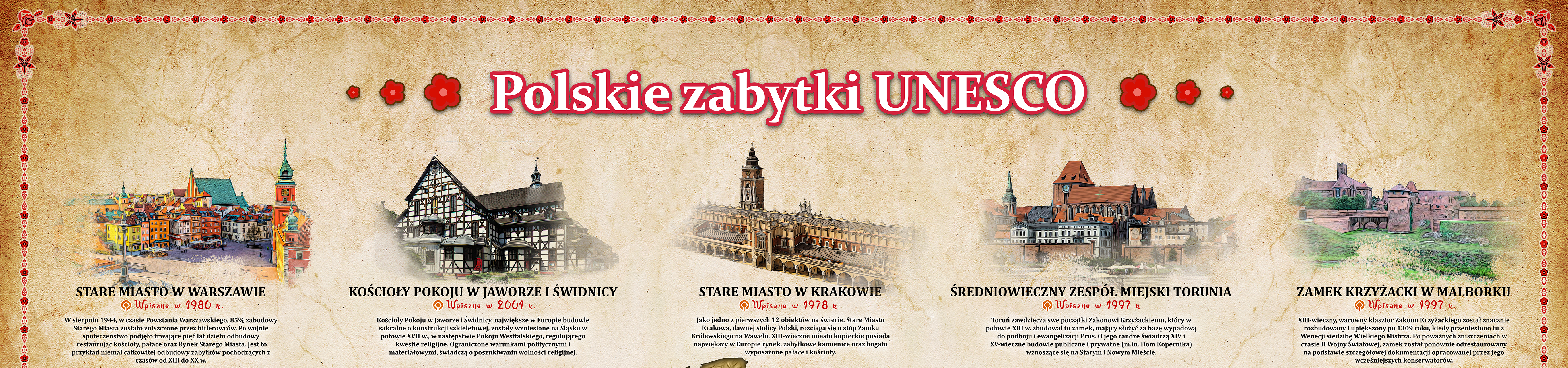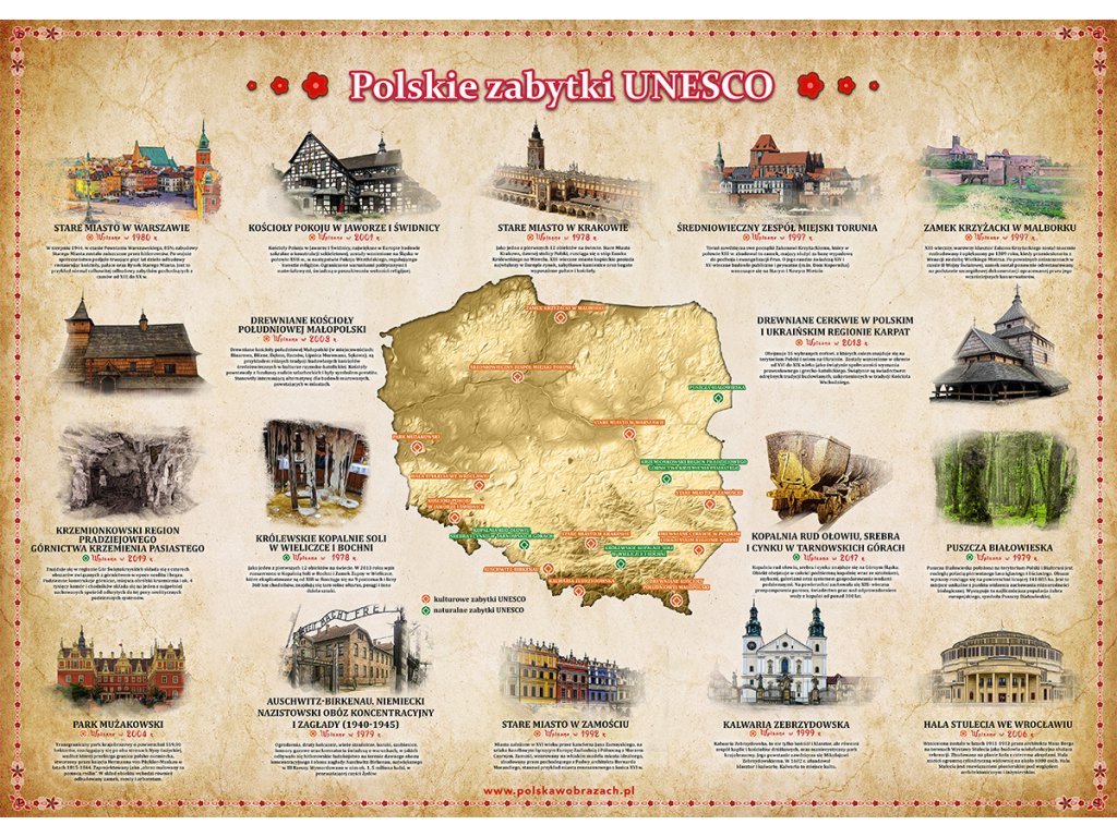Polska historia i kultura są niezwykle bogate i fascynujące. Nic dziwnego, że wiele naszych zabytków znalazło się na liście UNESCO. Aby nie zapomnieć o żadnym z nich, przygotowaliśmy przejrzystą i atrakcyjną planszę, która pomoże Ci je wszystkie poznać i zainspiruje do odkrywania piękna naszego kraju.
